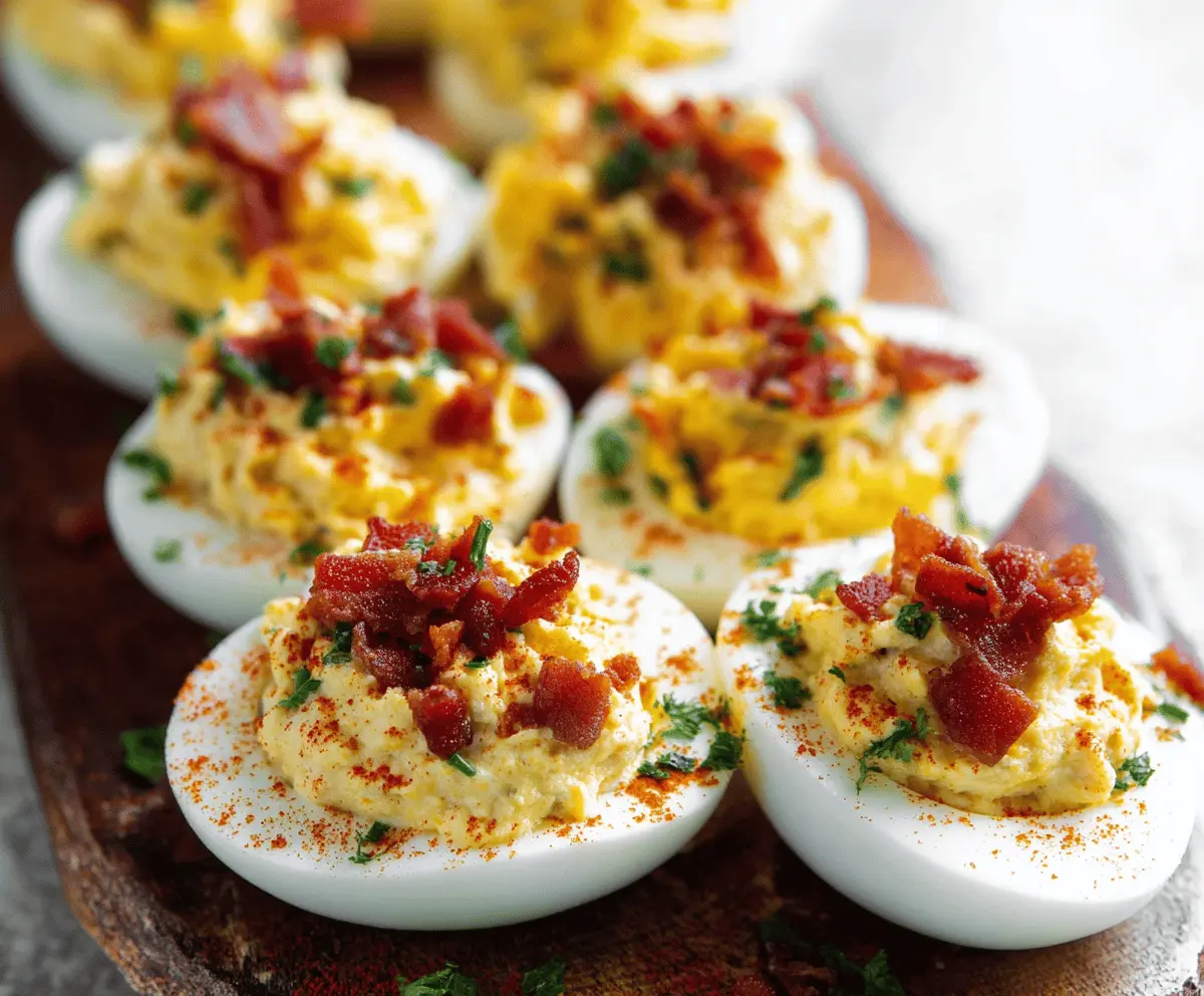 Bacon deviled eggs are a tasty twist on a classic favorite! Loaded with creamy yolk goodness and crispy bacon bits, these bite-sized treats are hard to resist!