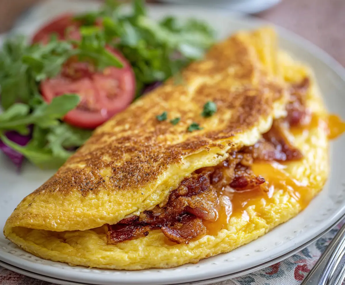 Enjoy your fluffy, cheesy, and savory Bacon Egg and Cheese Omelet!