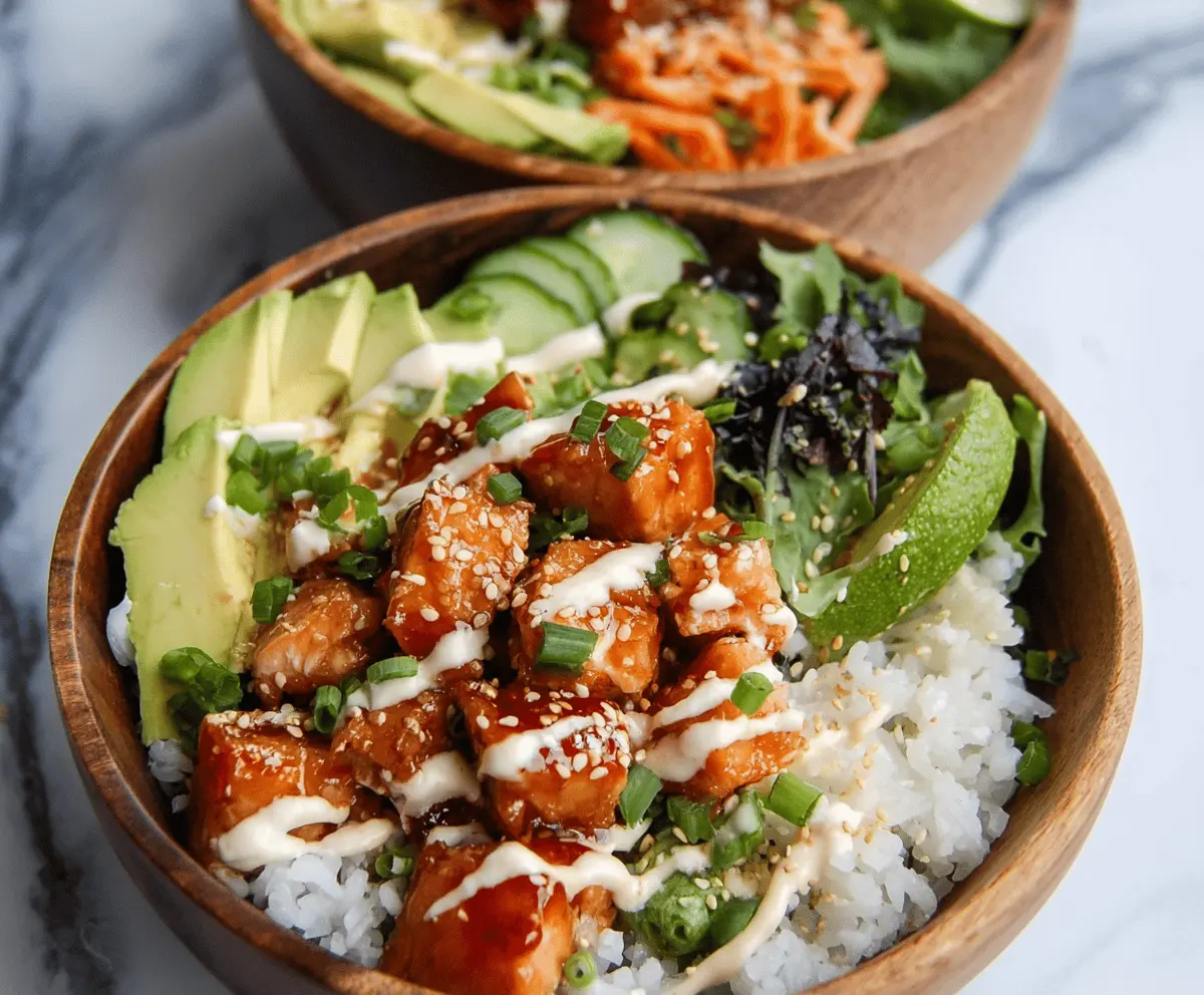 Delicious Bang Bang Salmon Bite Bowls with crispy salmon bites, fresh vegetables, and spicy mayo drizzle on a stylish plate