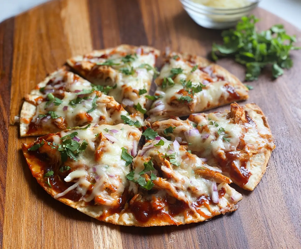 Delicious BBQ Chicken Tortilla Pizza topped with melted cheese and fresh ingredients