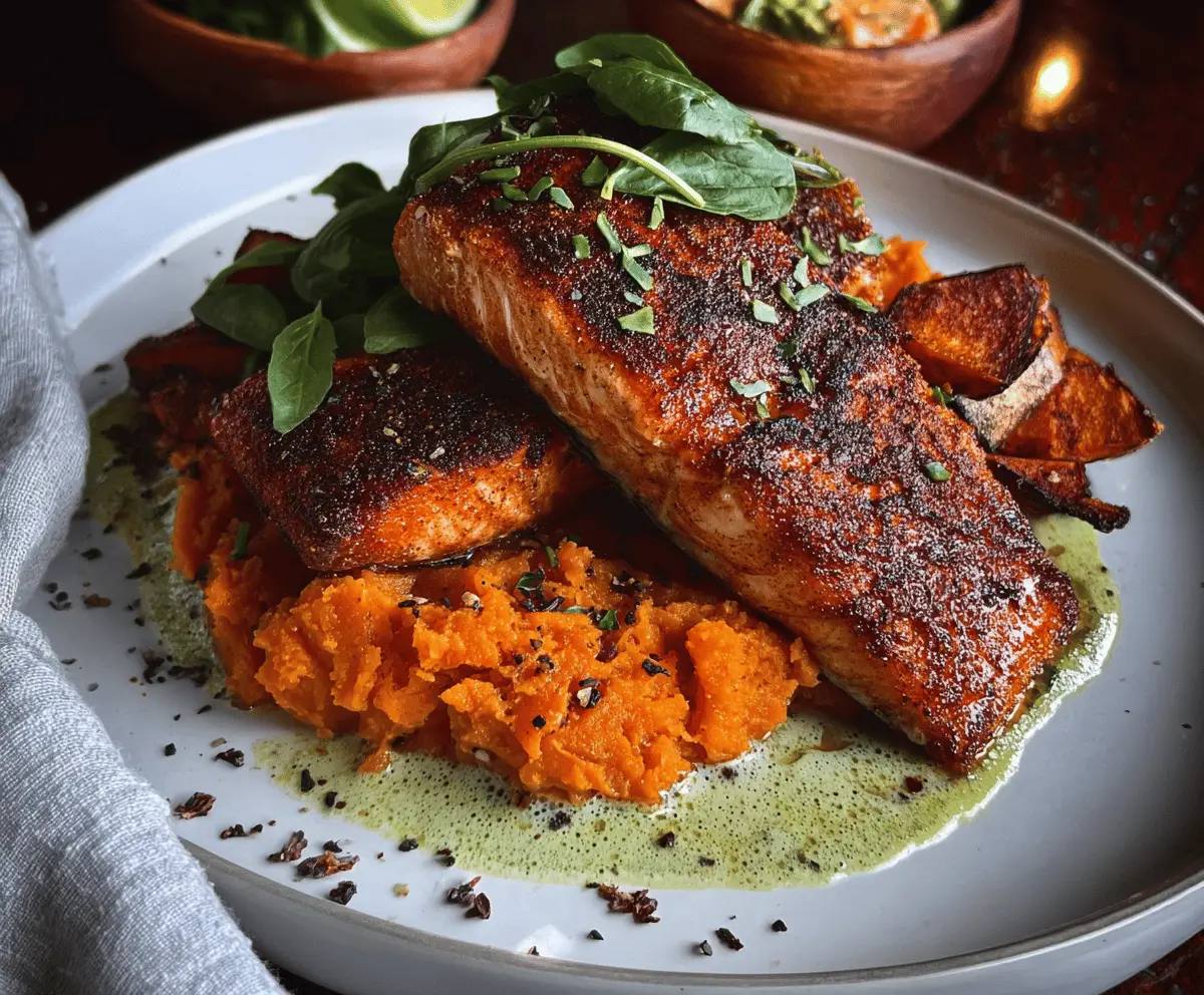 To serve, place a generous scoop of the mashed sweet potatoes on one side of your plate. On the other side, add a handful of mixed greens and some sliced avocado. Lay the crispy blackened salmon fillets either on top or beside the sweet potatoes.