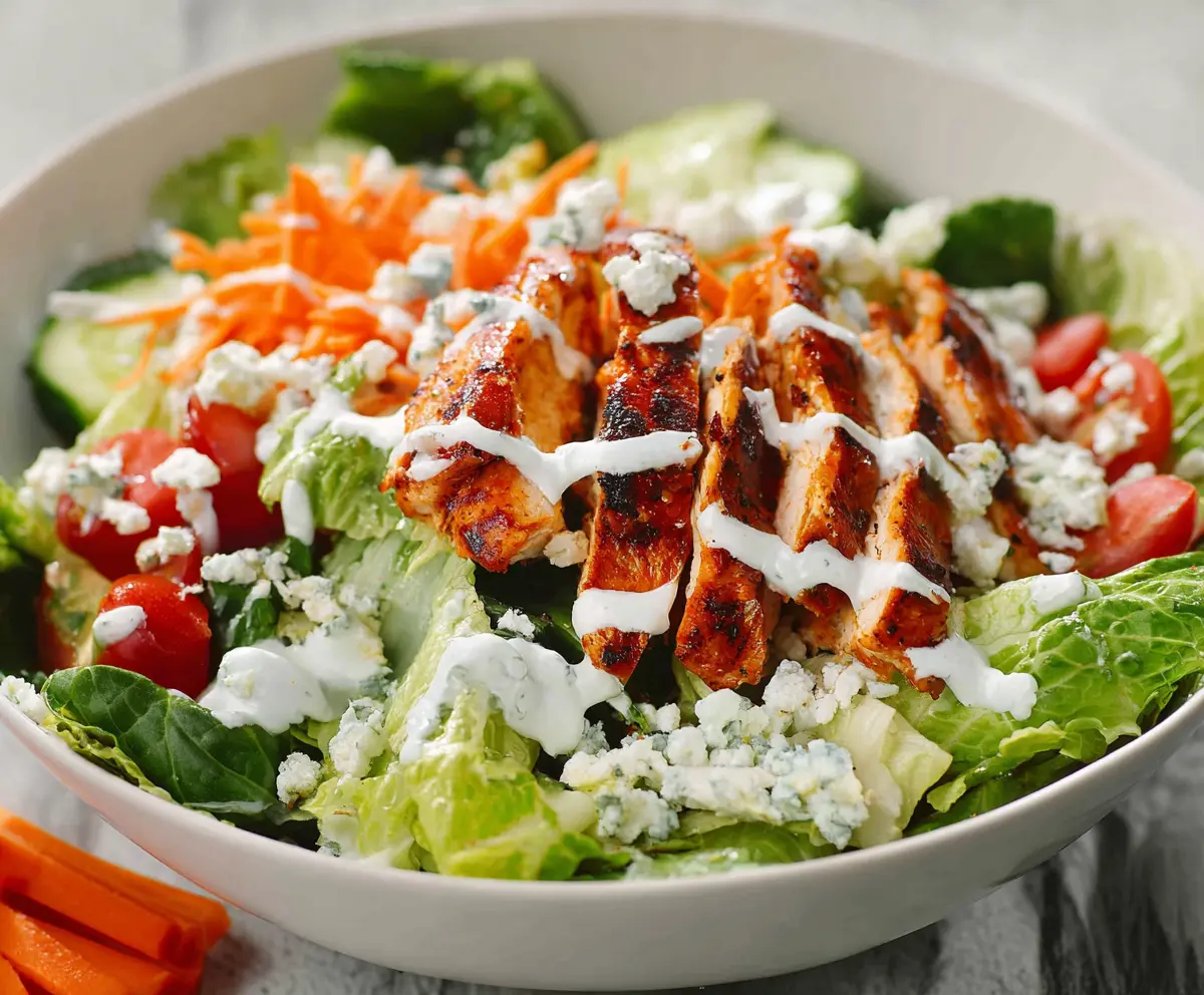This salad combines spicy buffalo chicken with fresh crisp veggies and a cooling ranch dressing for the perfect balance of flavors and textures. Enjoy your meal! 🥗🔥