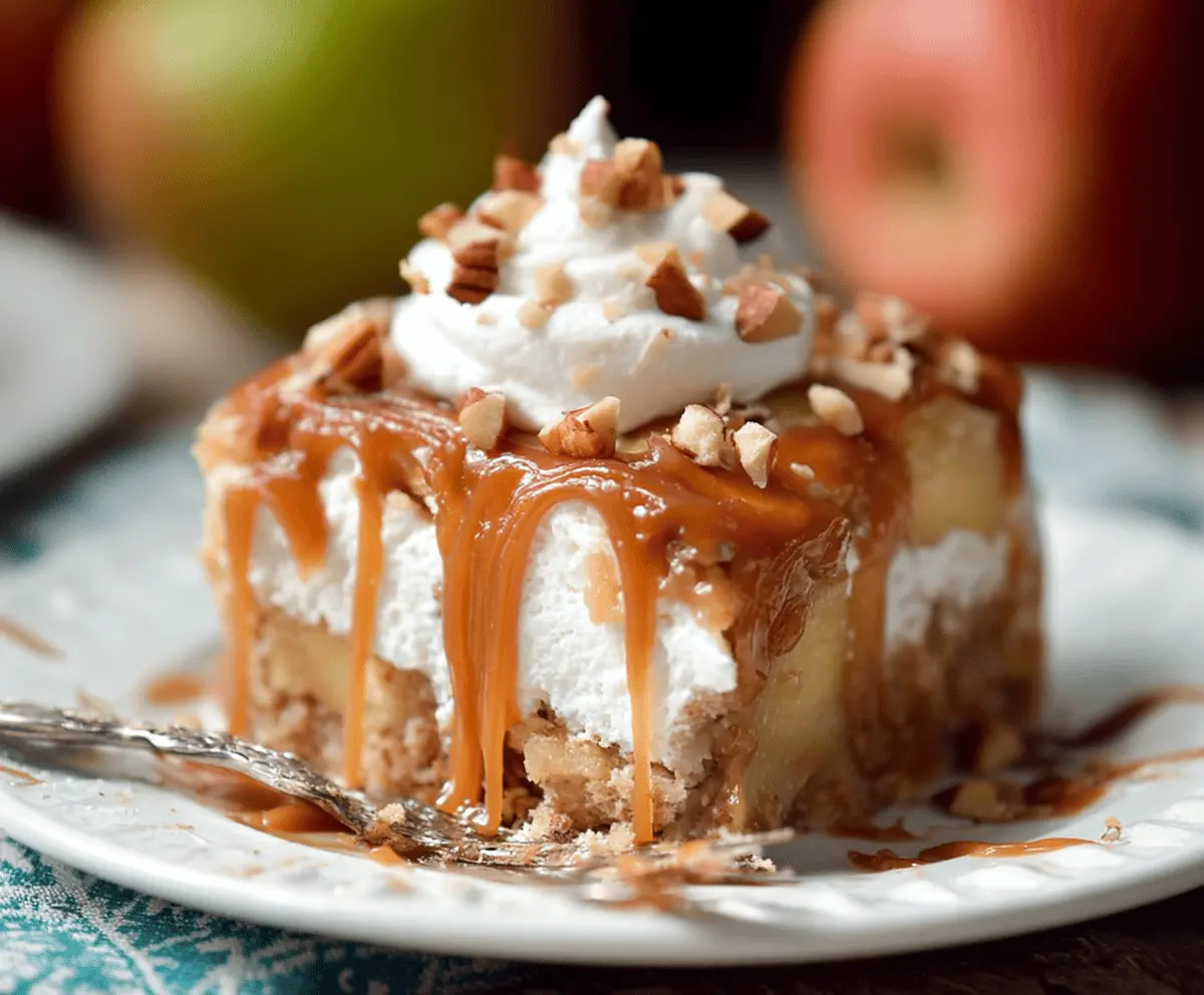 Finally, cut the cake into squares and serve it chilled or slightly warmed. Enjoy the delightful layers of flavors in this delicious Caramel Apple Poke Cake!