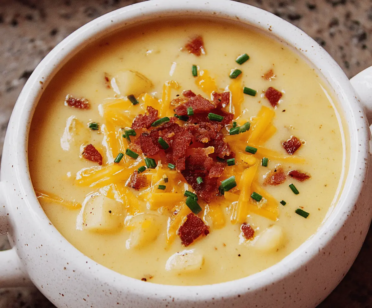 Finally, season your soup with salt and freshly ground black pepper to taste. Serve it hot, topped with crumbled bacon, extra shredded cheddar cheese, and a sprinkle of fresh chives for that pop of color!