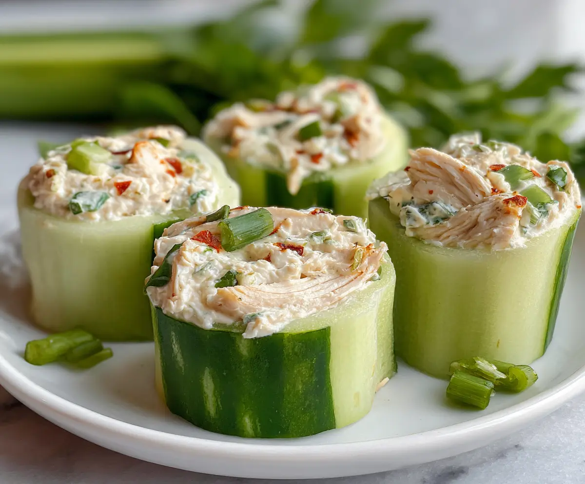These Chicken Salad Cucumber Roll Ups are a fun and fresh snack! They use crunchy cucumbers filled with creamy, tasty chicken salad. Perfect for a light lunch or an easy party treat!