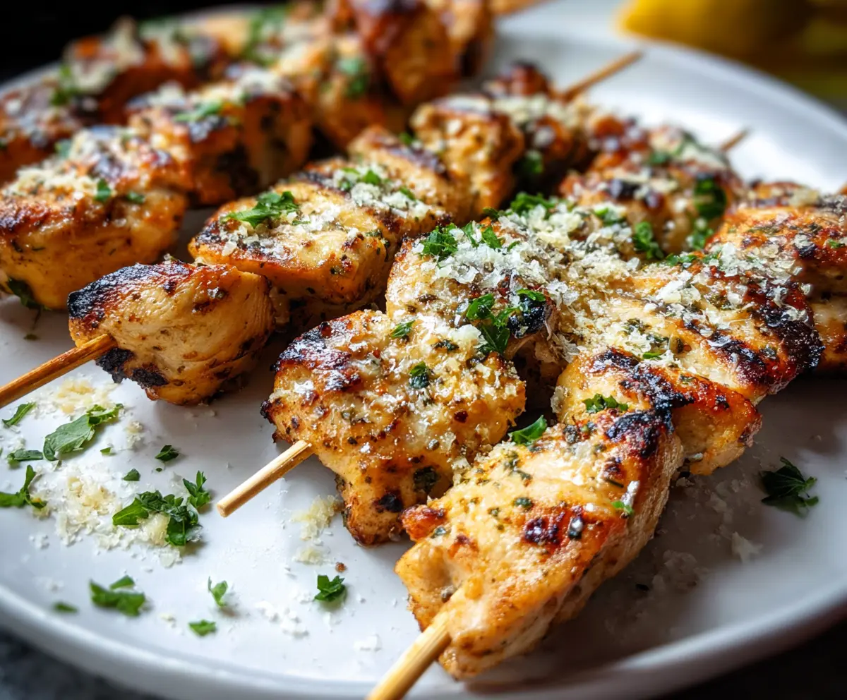 These yummy chicken skewers are packed with flavor thanks to garlic and zesty Parmesan. Perfect for grilling or baking, they make a great snack or dinner!