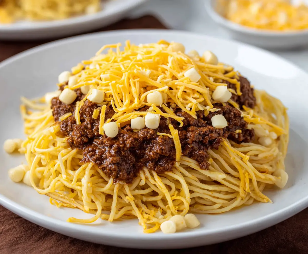 Your Cincinnati Chili Spaghetti is ready to enjoy! Serve it hot and savor every delicious bite!
