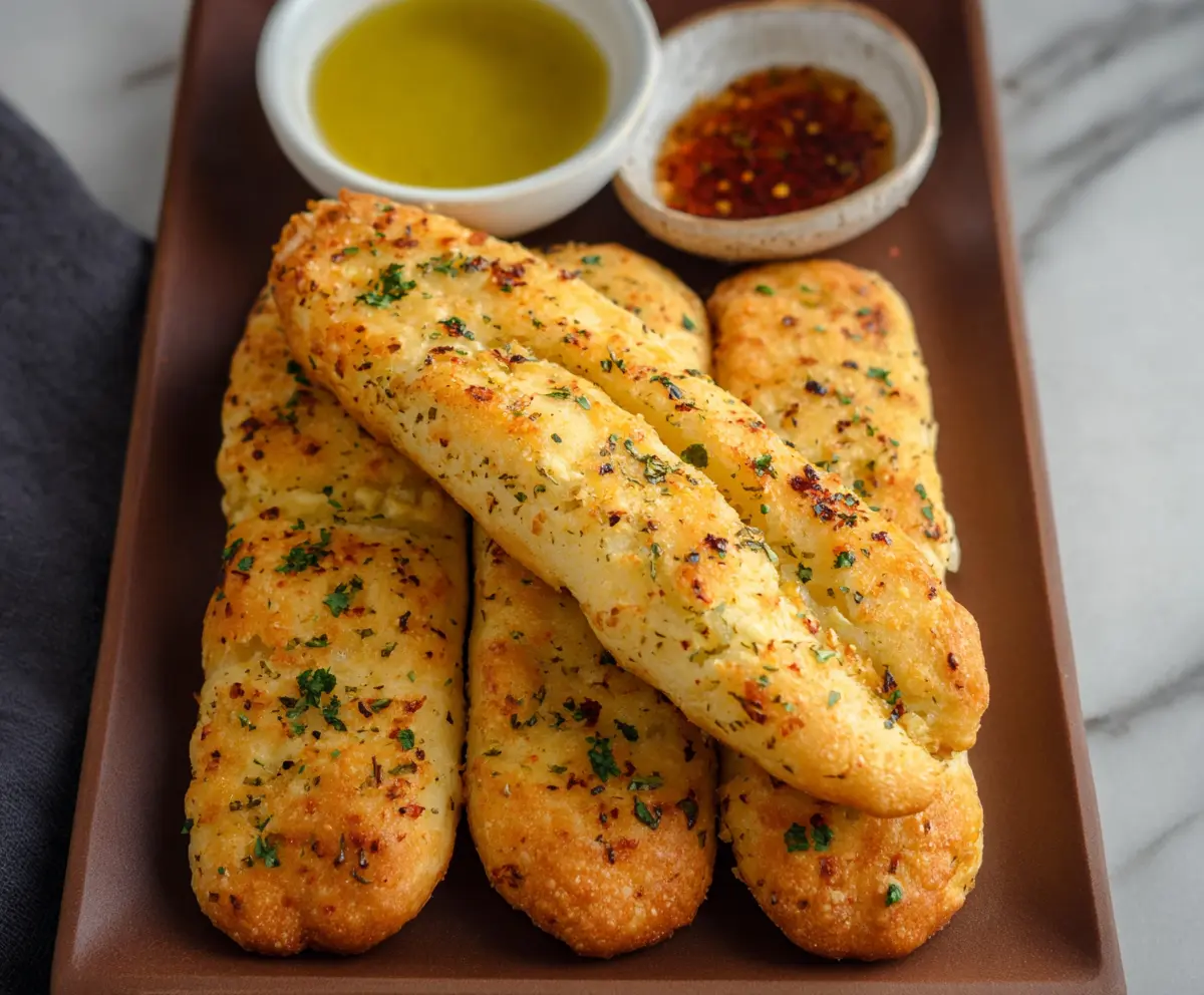 Delicious cottage cheese garlic breadsticks served fresh and golden-brown.