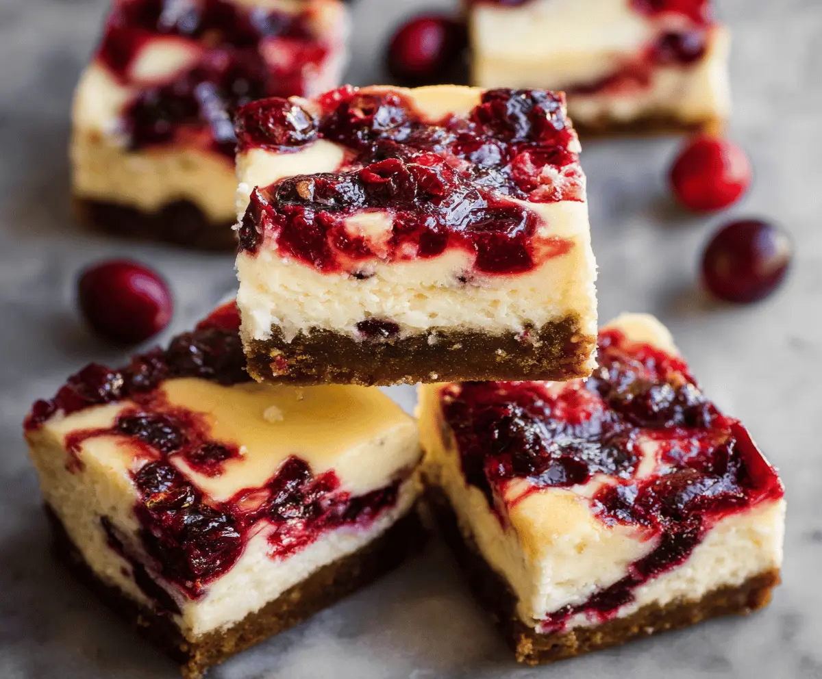 These cranberry cheesecake bars are a tasty treat that combines creamy cheesecake with a hint of tart cranberries. They sit perfectly on a buttery crust, making every bite a delight!