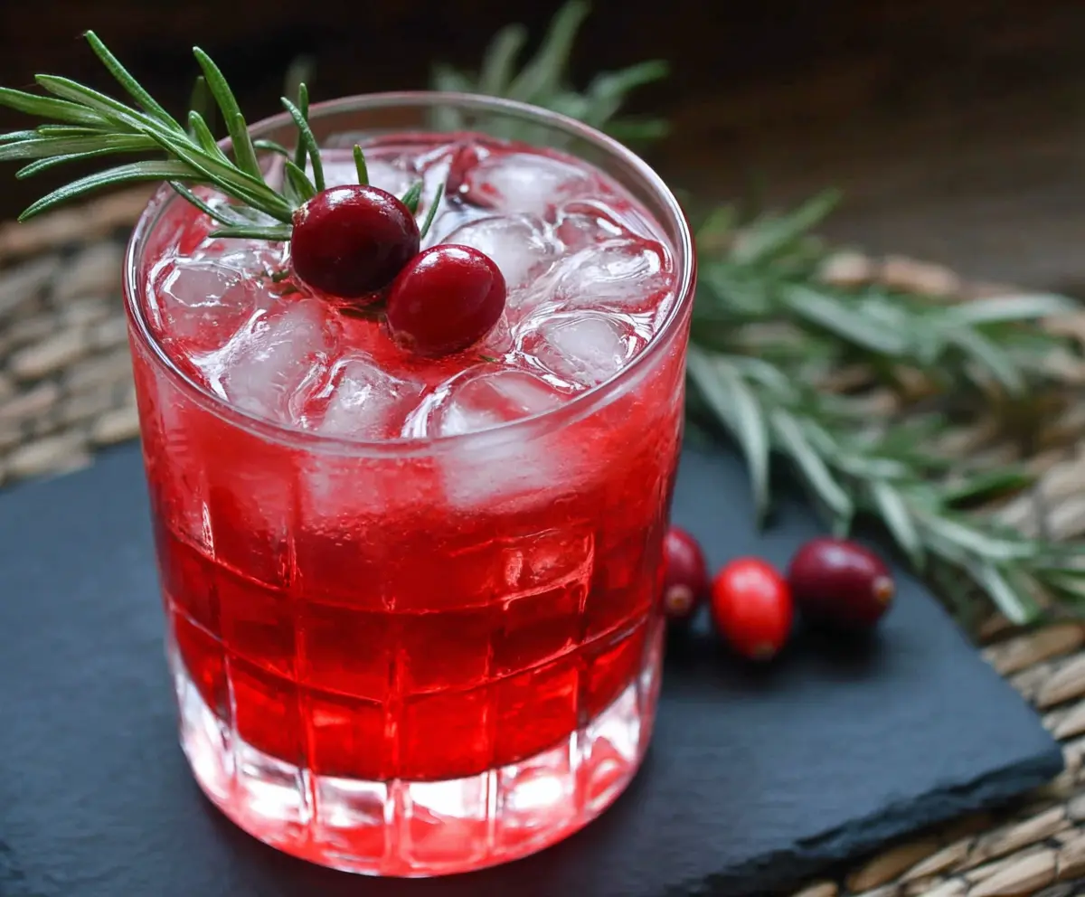 A vibrant cranberry rosemary vodka cocktail garnished with fresh cranberries and rosemary sprigs.