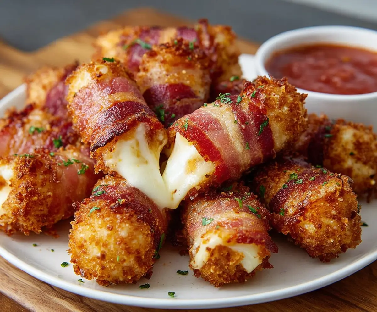 Once they’re done, remove them from the oven and let them cool for a minute. Serve warm with your favorite dipping sauce, like marinara or ranch, and enjoy that perfect combination of gooey mozzarella, crispy bacon, and crunchy coating!