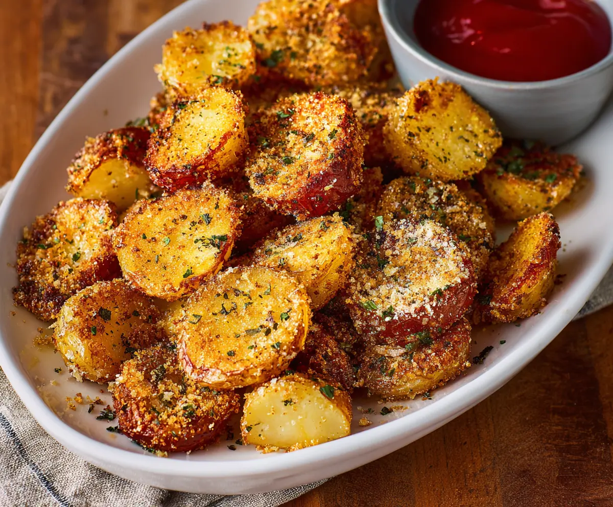 These crispy garlic parmesan crusted potatoes are like little golden bites of joy! They’re covered in a tasty mix of garlic and parmesan, making them super flavorful and crunchy.