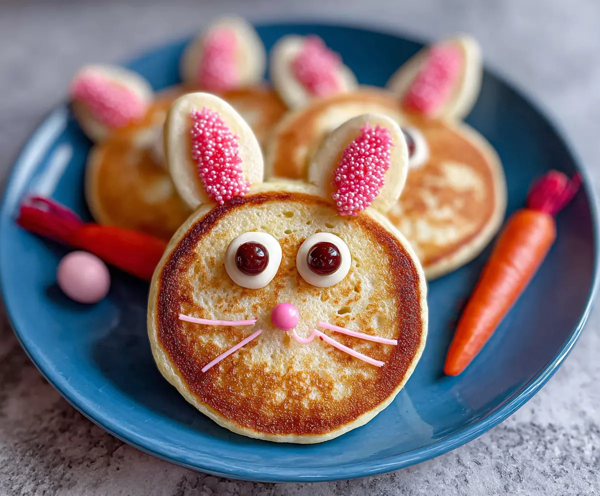 Once the pancakes have cooled slightly, it’s time to decorate! Use white icing or whipped cream to pipe bunny eyes, whiskers, and a mouth. Add chocolate chips or small candies for the pupils in the eyes, and use pink candy or a gummy for the bunny nose. Then attach the ears on top of the large round pancake.