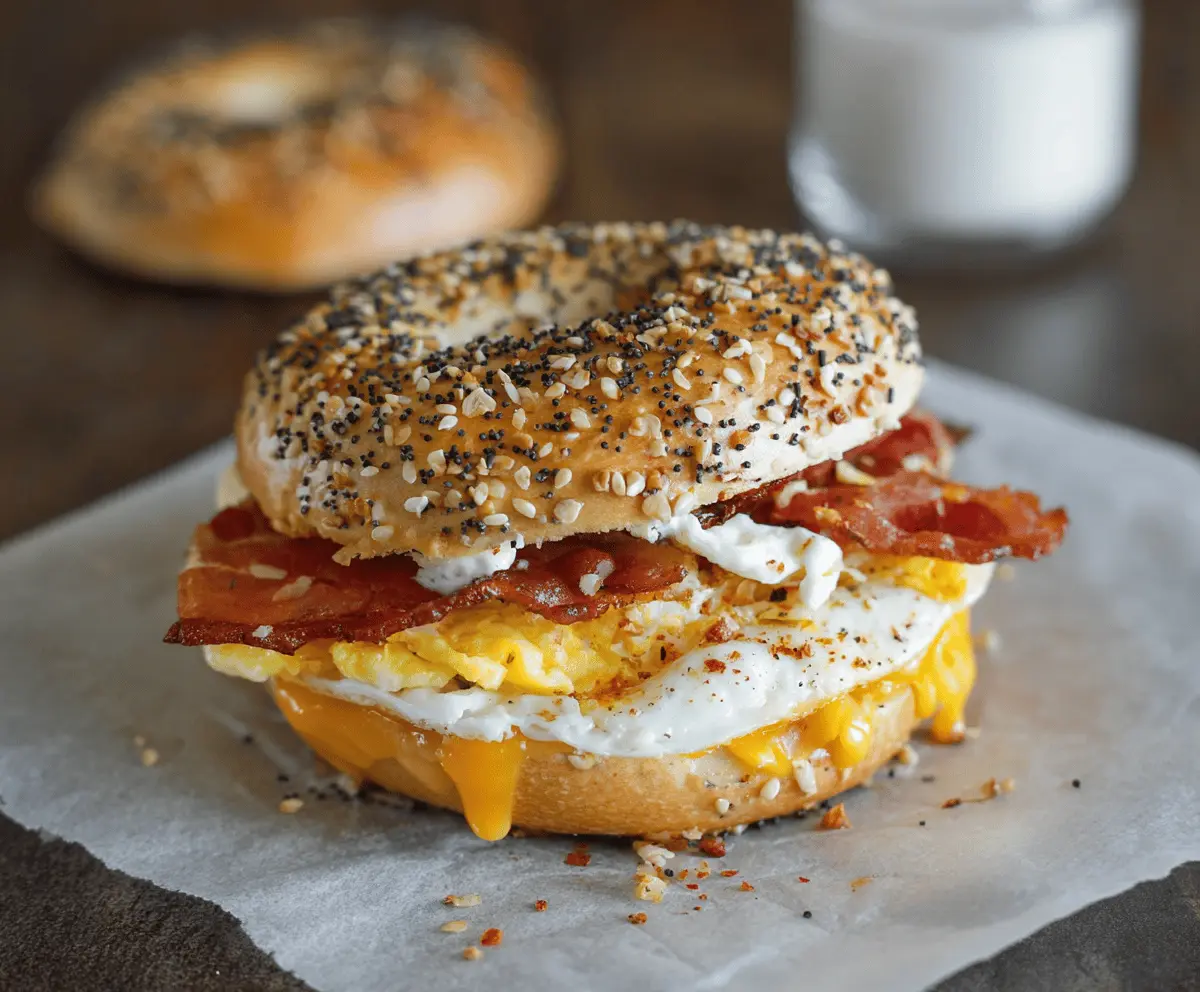 Serve the sandwich immediately while it’s warm. Enjoy the rich flavors of everything bagel, creamy cheese, crispy bacon, and fluffy eggs—all in one amazing bite!