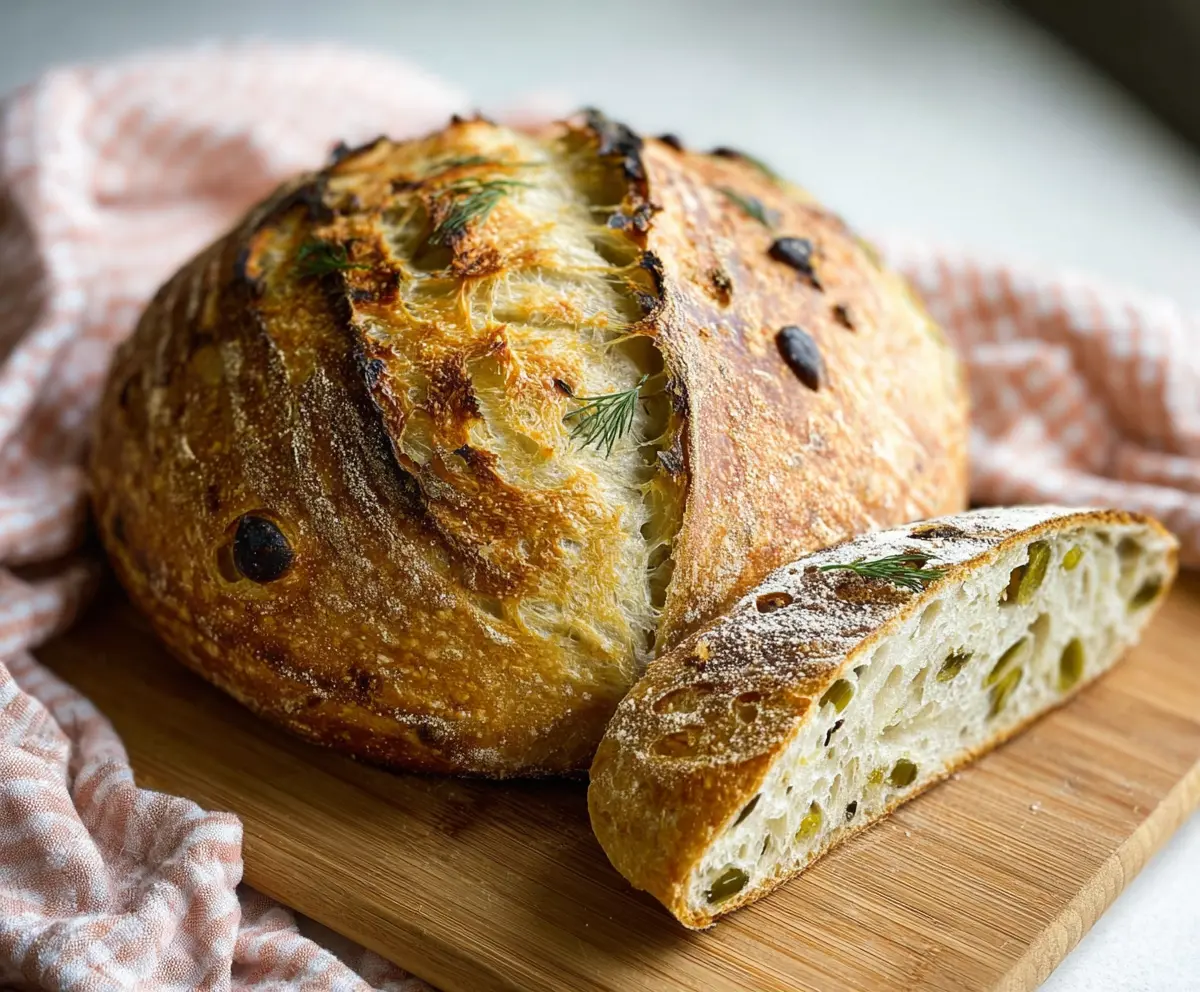 Freshly baked sourdough bread with dill pickles and herbs, perfect for sandwiches and snacks.