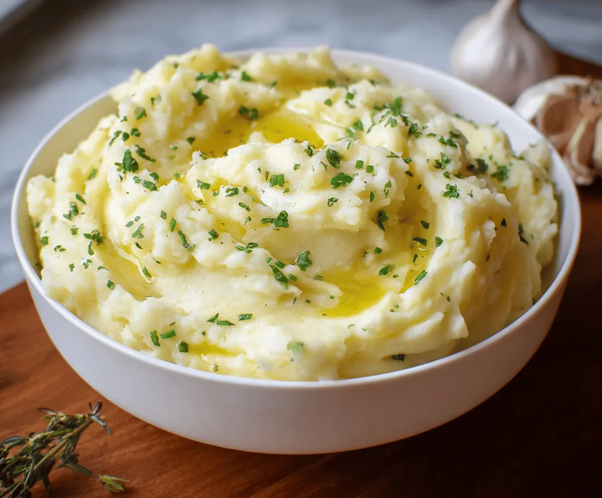 Creamy garlic mashed potatoes garnished with fresh herbs, perfect as a comforting side dish.