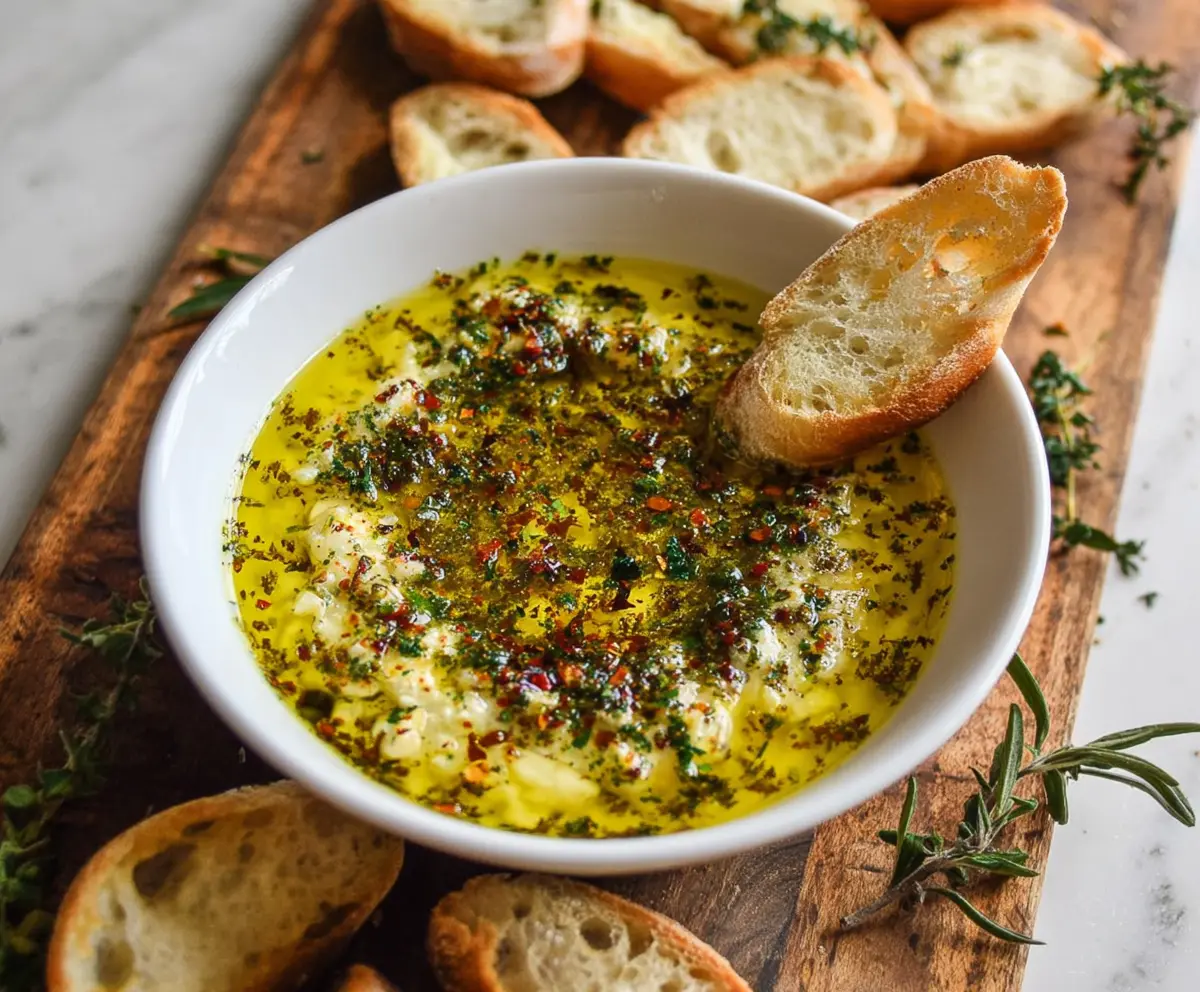 Allow the mixture to sit for about 10-15 minutes. This resting period is crucial as it helps the garlic and herbs infuse the olive oil with their delicious flavors, making your dip even more tasty.