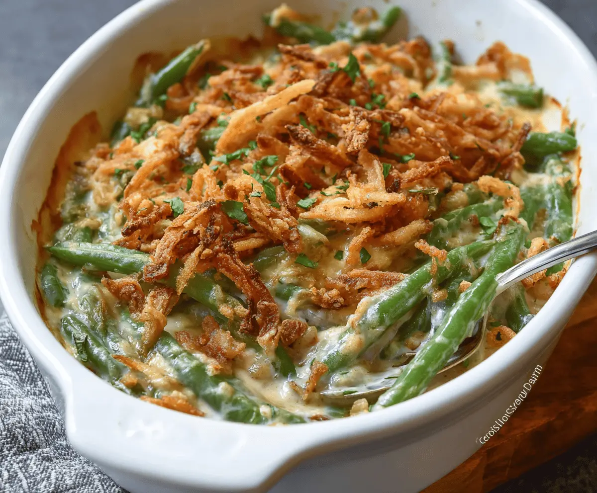 This green bean casserole is a comforting dish with fresh green beans, creamy soup, and crunchy onion topping. It’s perfect for family gatherings or a cozy dinner.