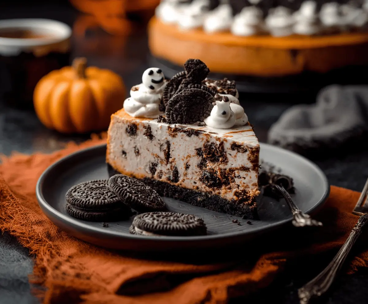 It’s so fun to serve this cheesecake with some creepy decorations. I love how the cookie crumbles add a delicious crunch. You might find yourself sneaking extra slices—no judgment here! 👻