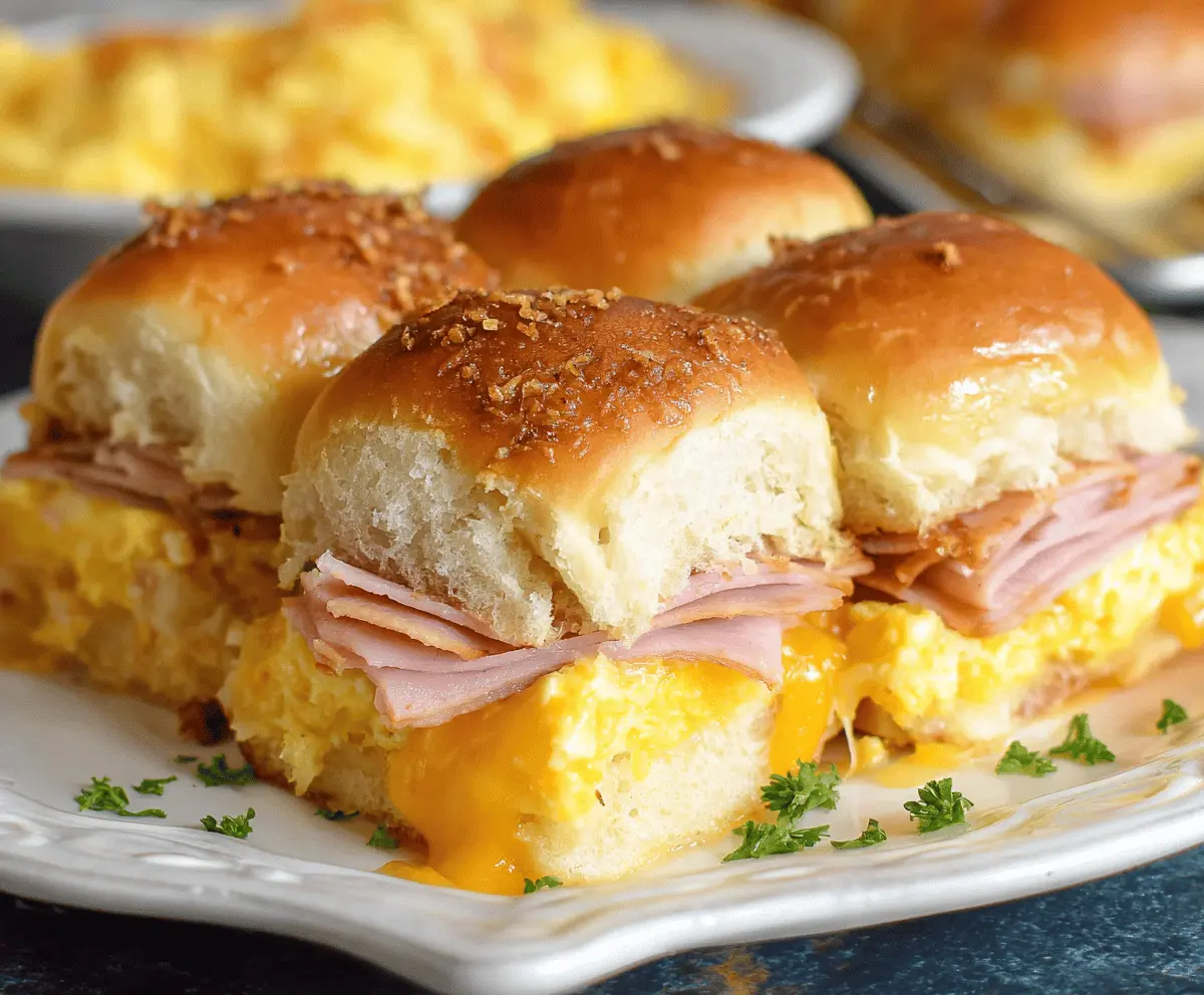 Remove the sliders from the oven and sprinkle with dried or fresh parsley for a pop of color. Serve them warm, and enjoy your delicious Ham and Cheese Breakfast Sliders with family or friends!