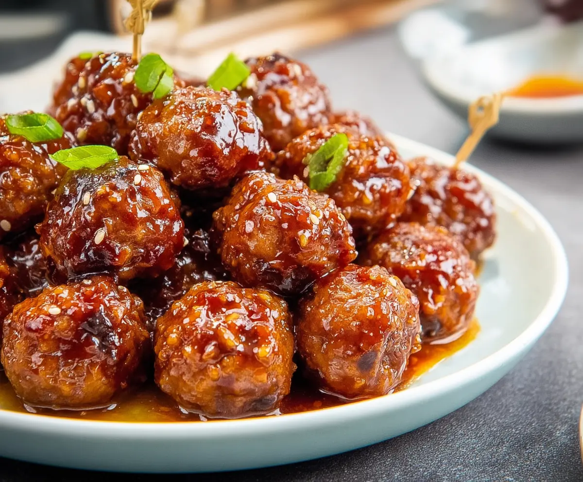 Delicious honey garlic meatballs served on a plate with fresh herbs