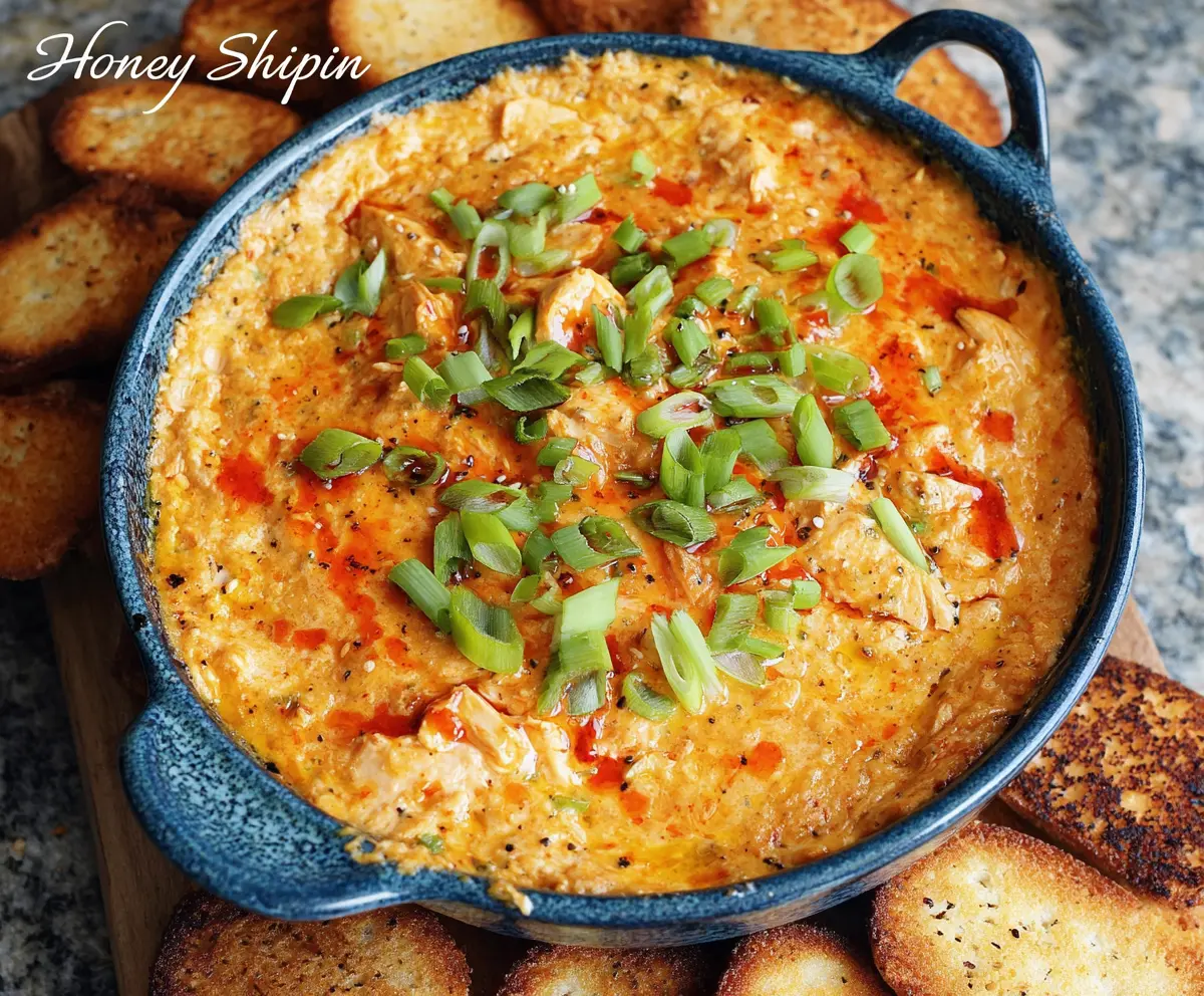 Once it’s done, carefully remove the dip from the oven. Sprinkle the chopped green onions on top for a fresh touch. If you’re looking for a little extra kick, feel free to add some red pepper flakes too!