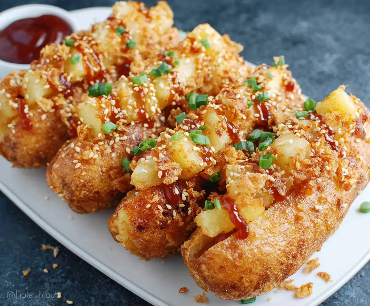 Put the fried potato hot dogs on a serving board. Drizzle them with Korean chili sauce or ketchup. For extra flavor and crunch, sprinkle crispy fried onions, cooked corn kernels, and garnish with sliced green onions on top.