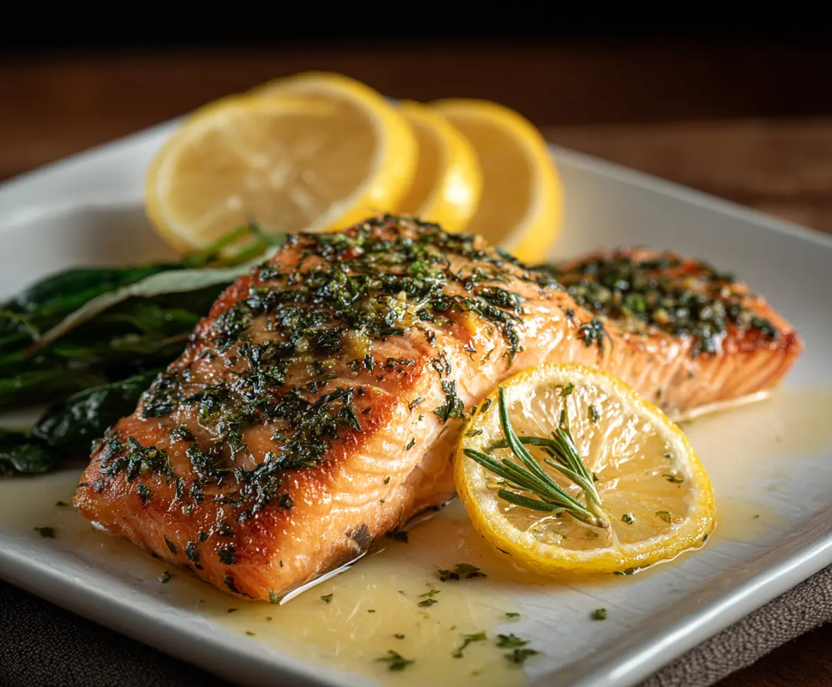Delicious Lemon Herb Salmon fillet cooked to perfection, garnished with fresh herbs and lemon slices.