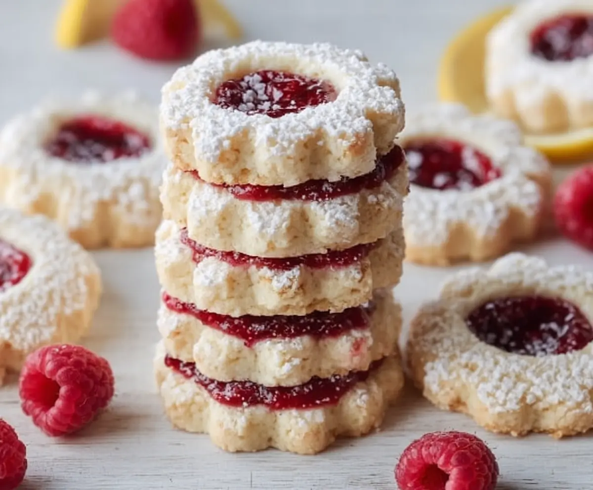 Finish by dusting the tops of the cookies generously with powdered sugar. For a beautiful presentation, you can even arrange fresh raspberries and lemon slices around them on the serving plate.