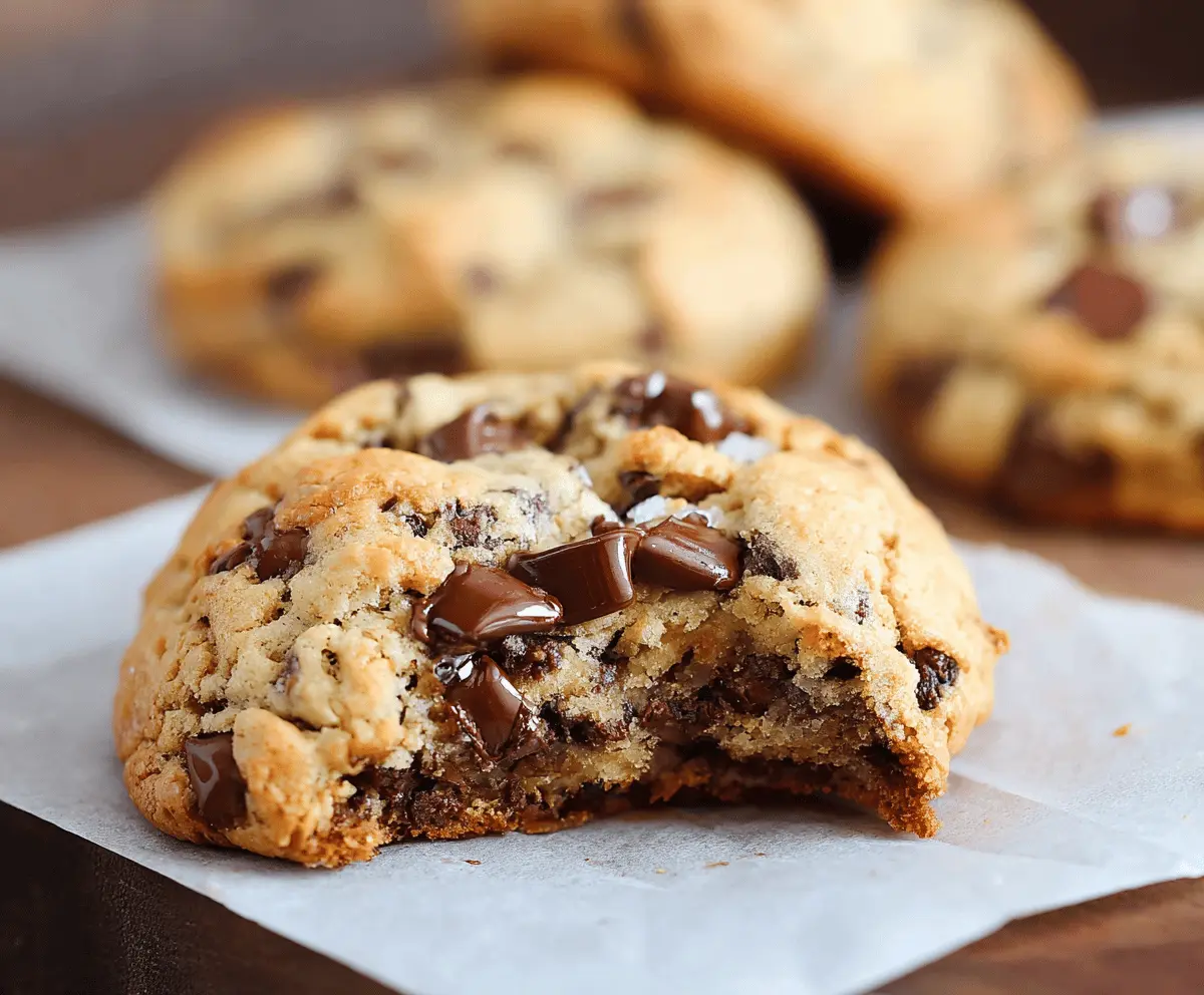 Freshly baked Levain Bakery chocolate chip cookies with gooey centers and golden crust on a rustic wooden table.