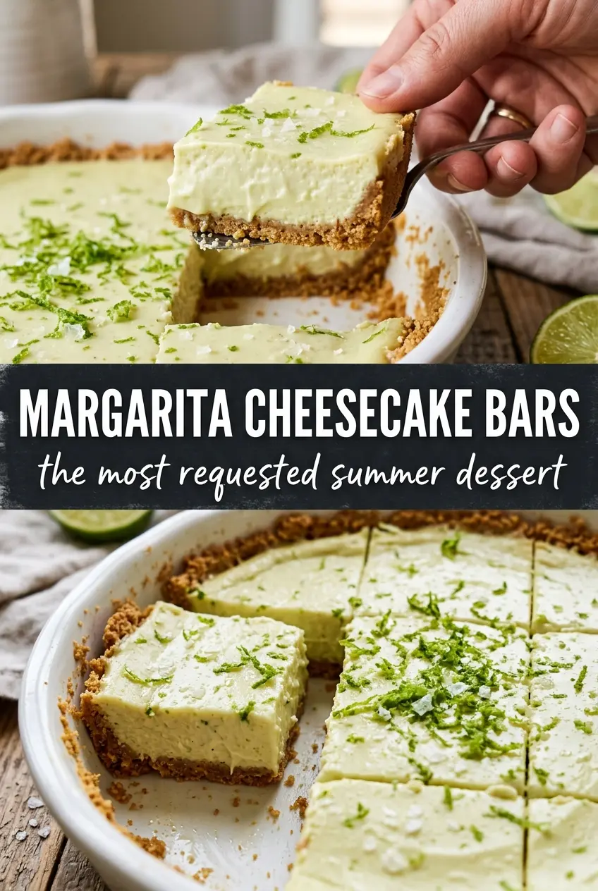 Margarita cheesecake bars with a creamy lime-infused filling and a tequila kick, baked on a golden graham cracker crust. The texture is silky and set around the edges with a gentle jiggle in the center for clean, sliceable layers.