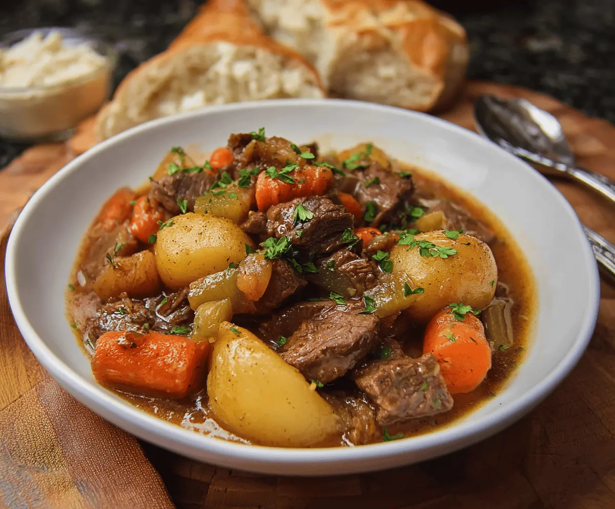Hearty Mississippi Beef Stew with tender beef chunks, vegetables, and flavorful broth served in a rustic bowl.
