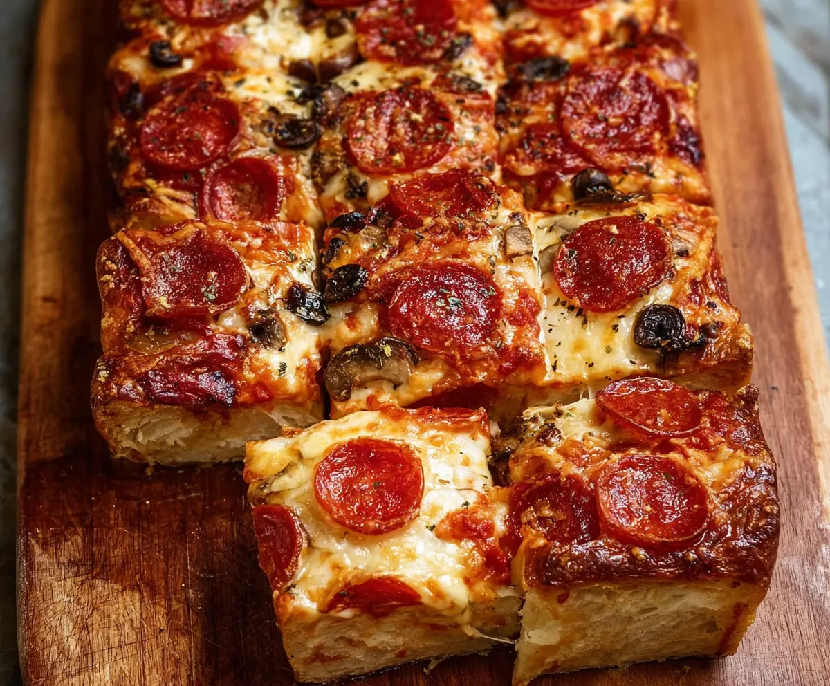 Take the pizza bread out of the oven and let it cool for a few minutes. Then slice it into squares or rectangles. Serve it warm with extra pizza sauce for dipping and enjoy every cheesy bite!