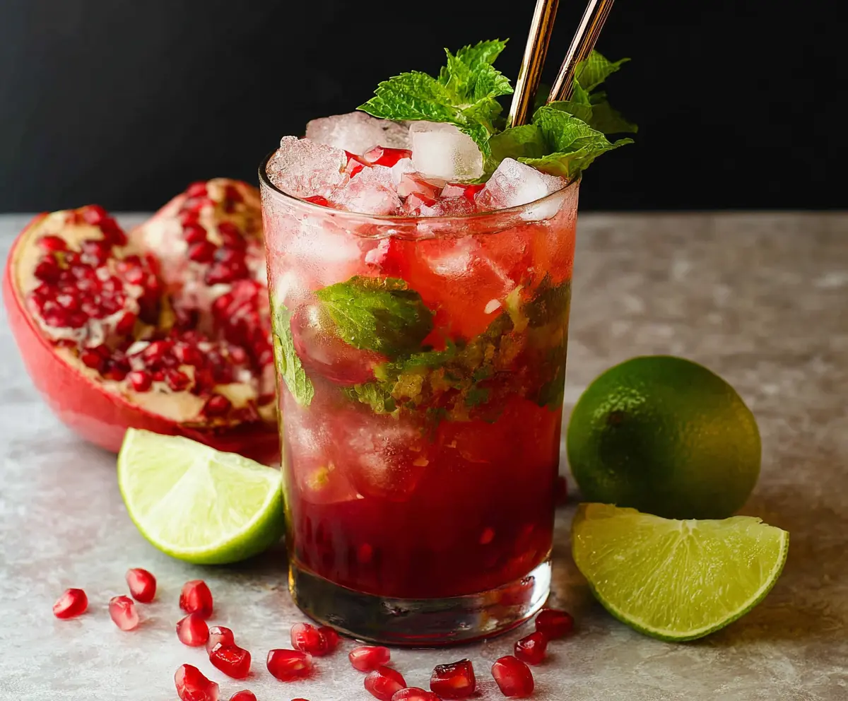 Refreshing Pomegranate Mojito cocktail garnished with mint leaves and fresh pomegranate seeds.