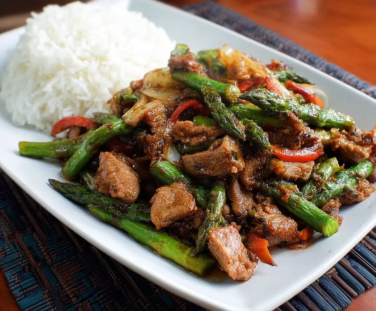 Finally, taste your stir-fry and adjust the seasoning with more salt or pepper if needed. Serve hot over a bed of steamed white rice, and enjoy your tasty and colorful Pork and Asparagus Stir Fry!
