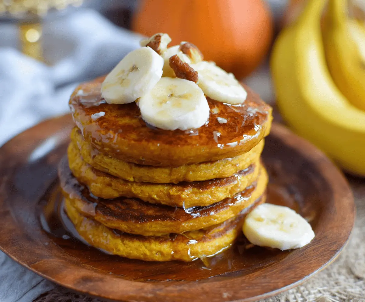 Serve your fluffy pumpkin banana pancakes stacked high, topped with fresh banana slices, a dollop of whipped cream if desired, and a generous drizzle of maple syrup. Enjoy this cozy and delightful breakfast!