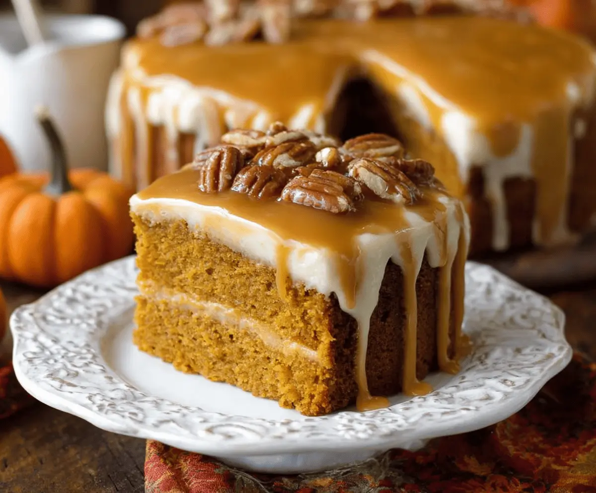Slice up your delicious pumpkin cake, serve it on your favorite plates, and enjoy every bit of this moist and warmly spiced treat topped with rich caramel frosting. Perfect for any occasion!
