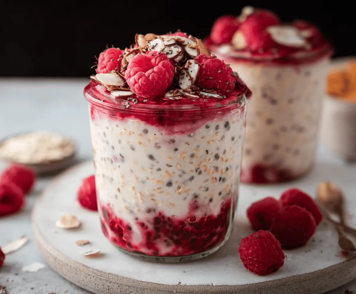 Raspberry Overnight Oats are a quick and tasty breakfast option! Just mix oats, milk, and fresh raspberries, then let them sit overnight in the fridge. In the morning, you have a creamy, fruity delight!