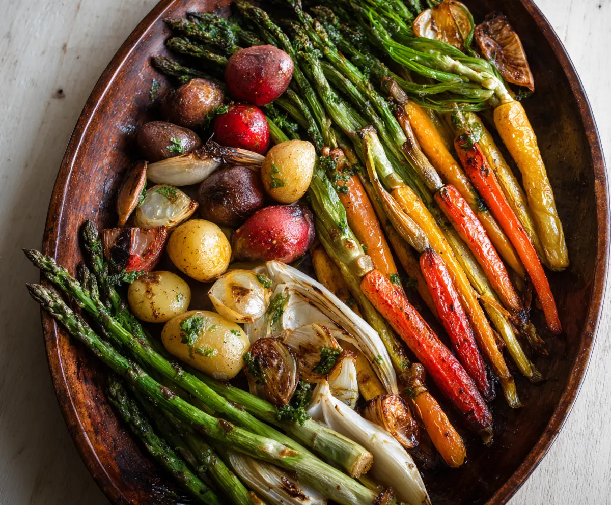 Roasted spring vegetables are a colorful and tasty dish, bursting with fresh flavors. You can use carrots, asparagus, and bell peppers, all tossed in olive oil and herbs!