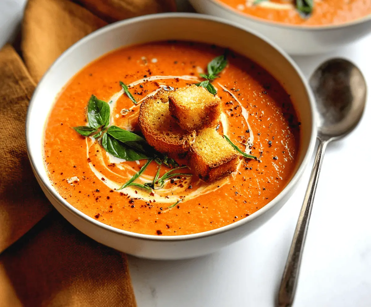 Creamy roasted tomato soup served in a bowl with fresh basil garnish and crusty bread on the side.