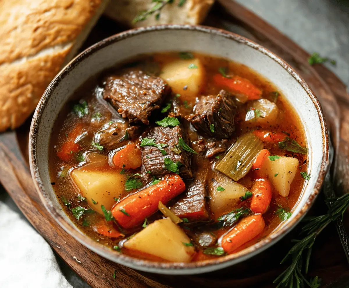 Delicious slow cooker beef stew with tender beef, carrots, potatoes, and vegetables in a savory broth