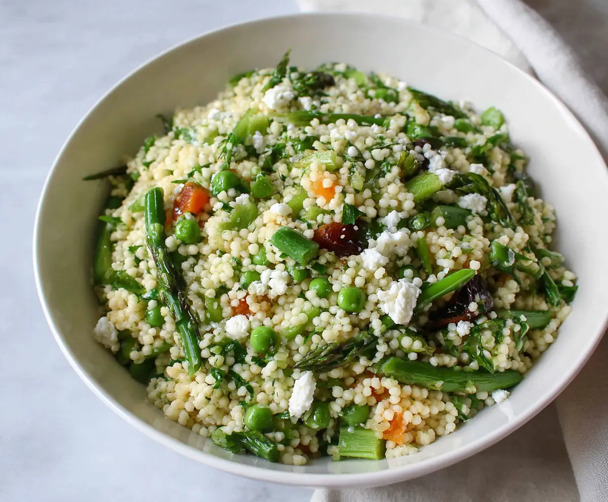 Colorful Spring Couscous Salad with fresh vegetables and herbs, perfect for a light meal or side dish